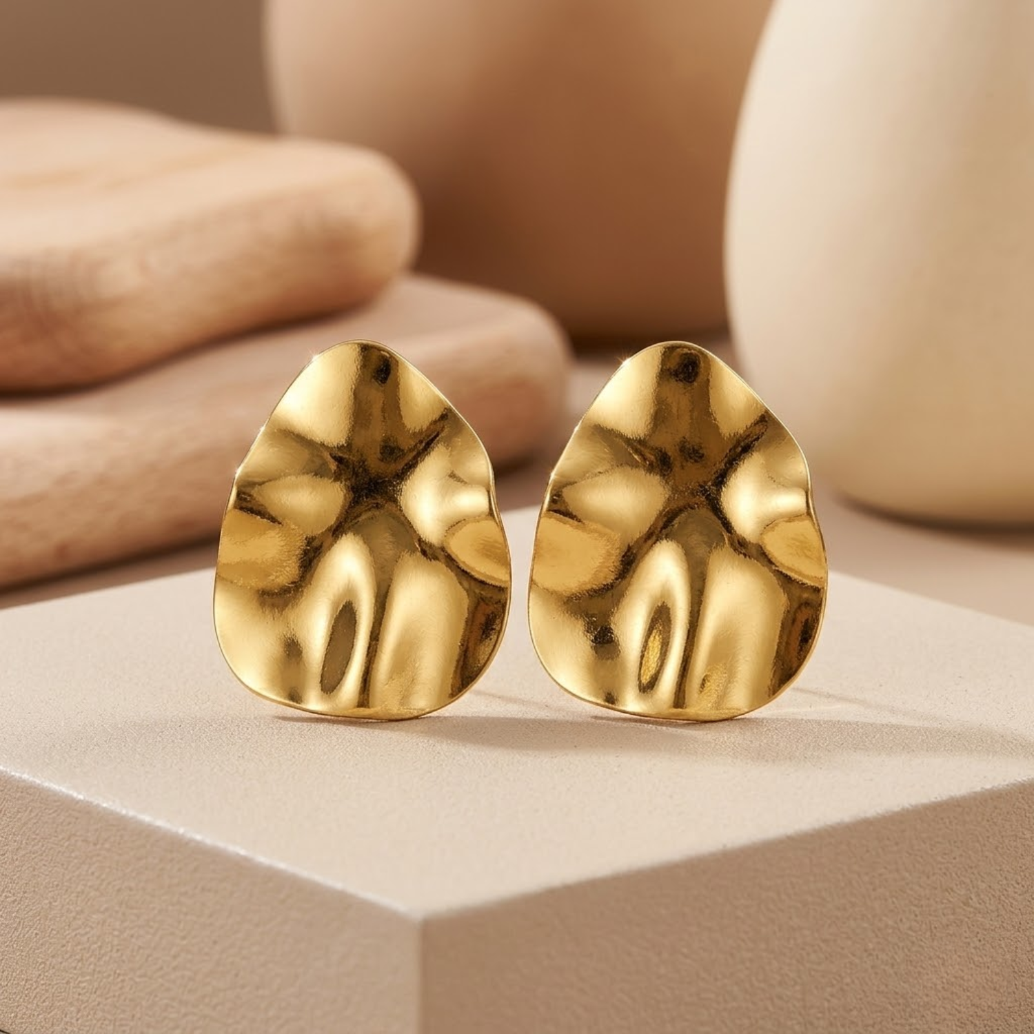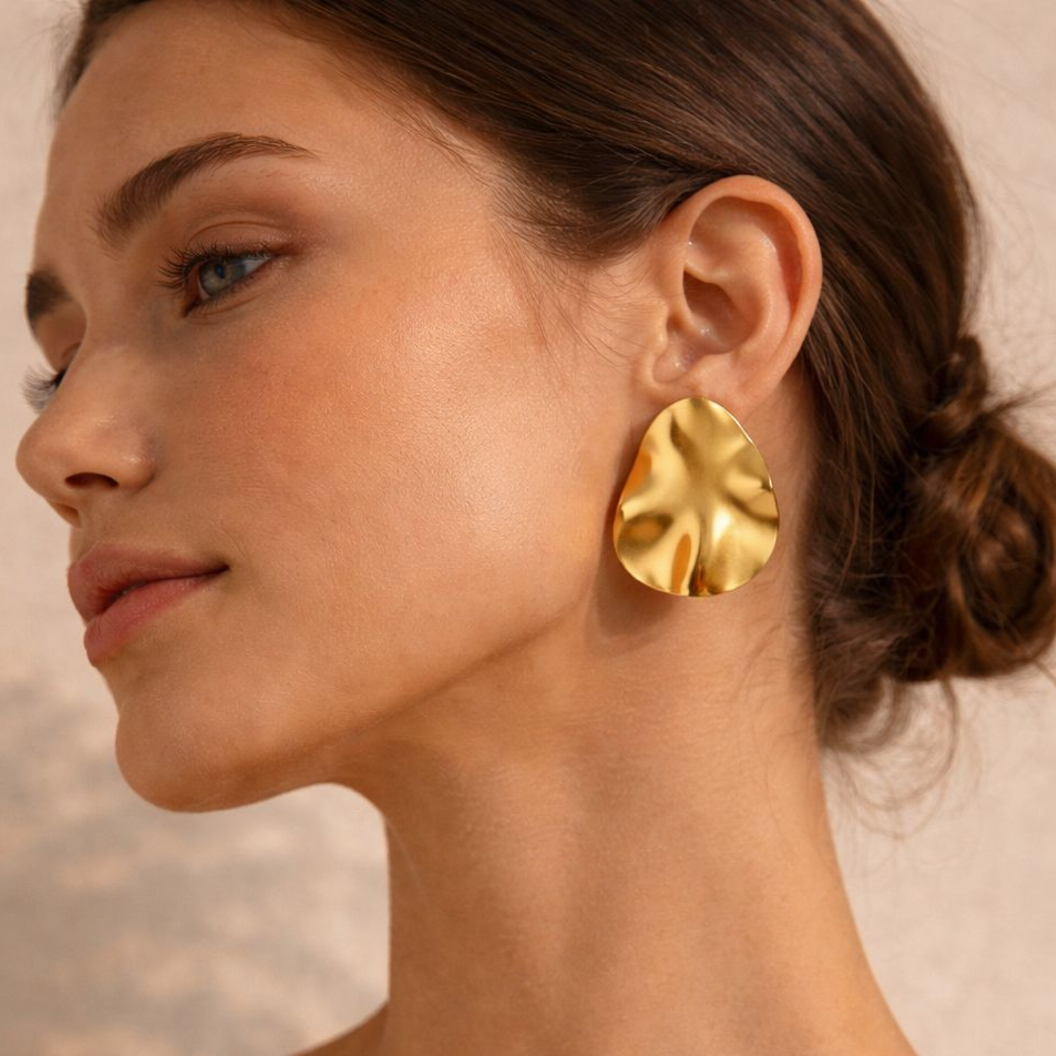 A 304 18K real gold plated stainless steel PVD coated, Irregular petal shaped stainless steel gold plated studs. Modern sculptural luxury finish. Classy yet vibrant.