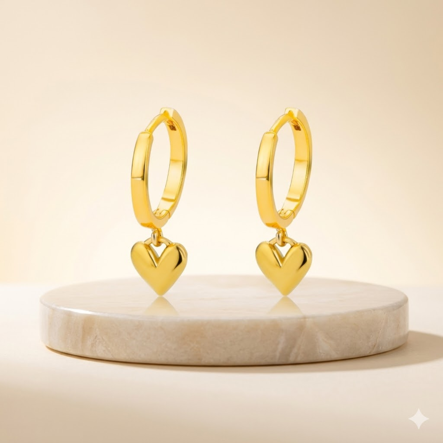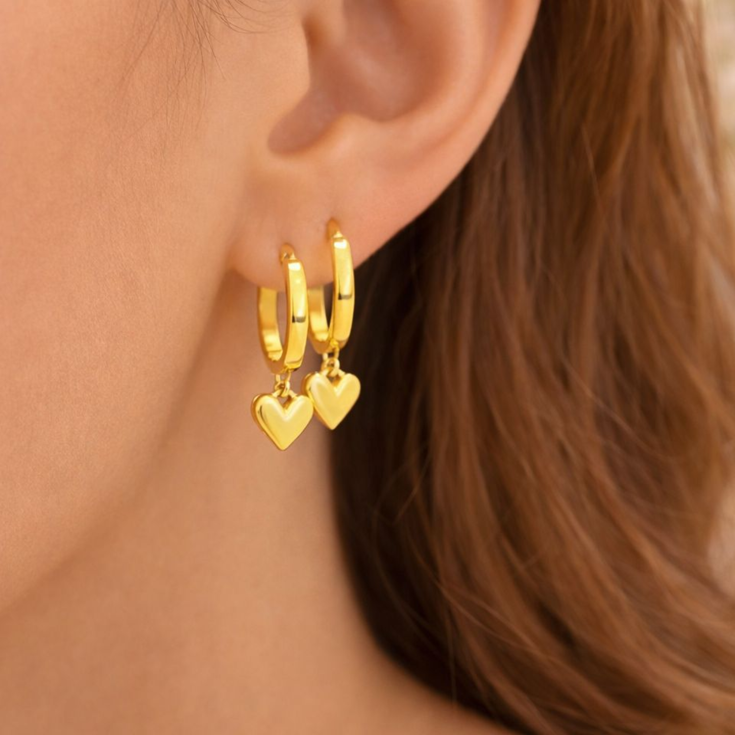 A 304 stainless steel /copper geometric lock charm hoops with modern gold finish heart shaped tessel. Style with everyday elegance.