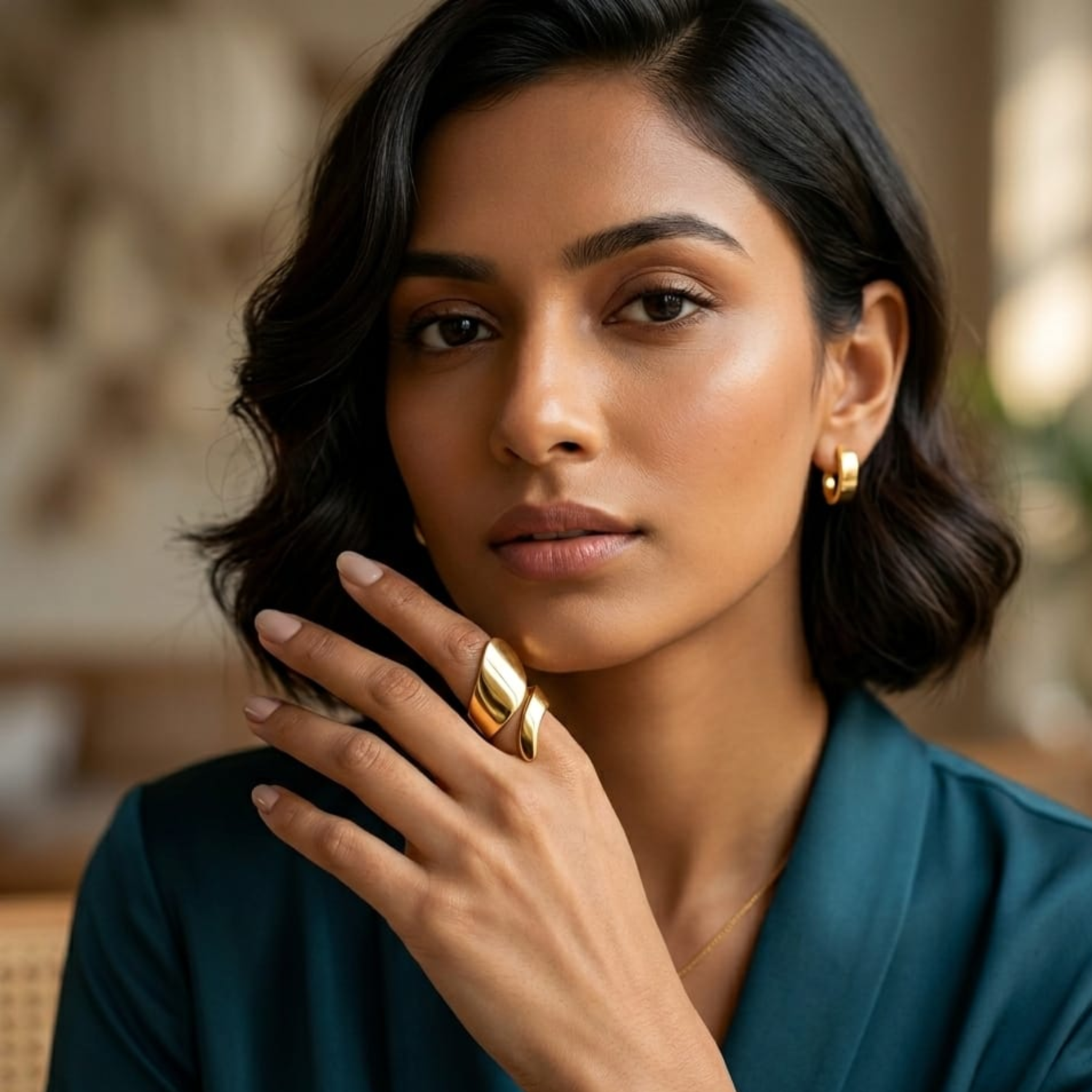 A 304 18K real gold plated stainless steel PVD coated Modern curved adjustable gold statement ring. Minimal bold design create your every look bold and modern.