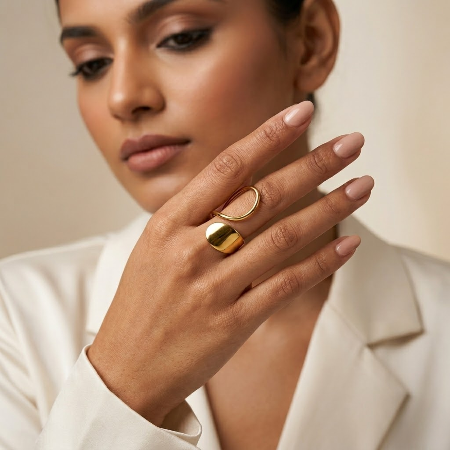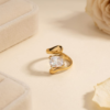 A 304 18K real gold plated stainless steel PVD coated adjustable modern sculpt ring with smooth finish. Enhances your modern look in evey function.