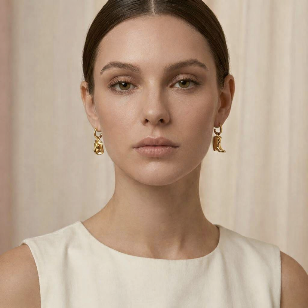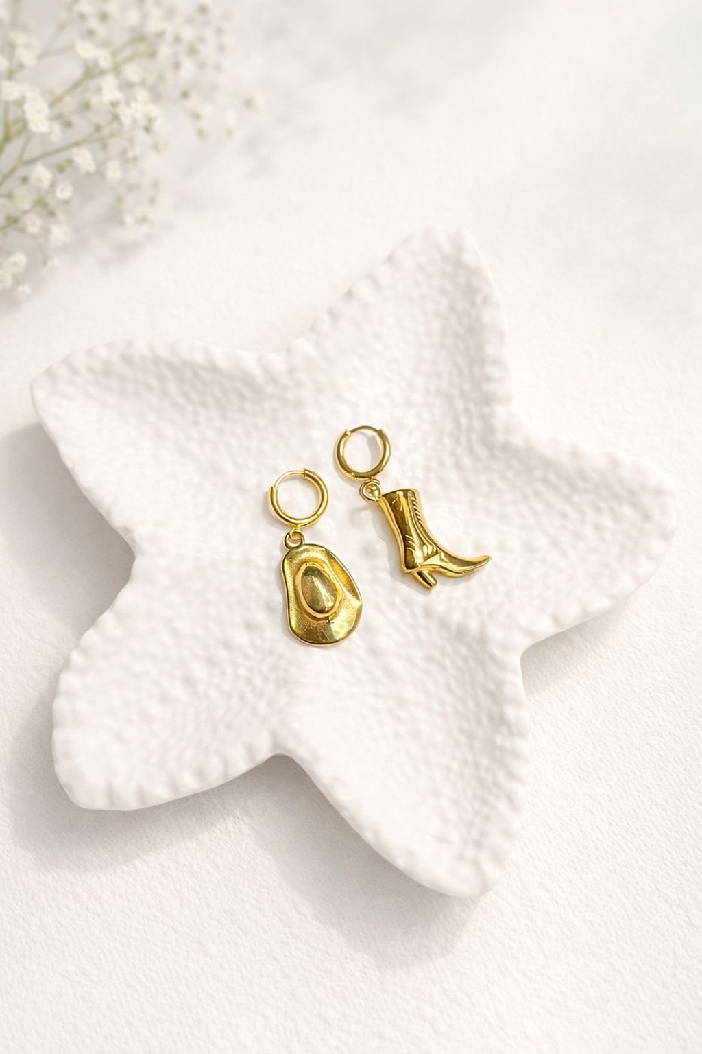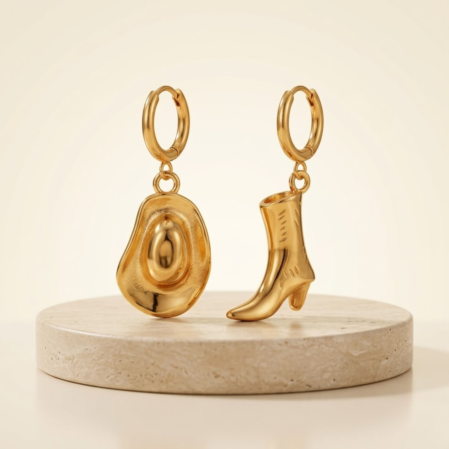 A 316 18k real gold plated stainless steel hat & boots inspired statement earrings with bold gold plating. Match with your elegent attire to look flawless.